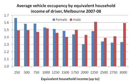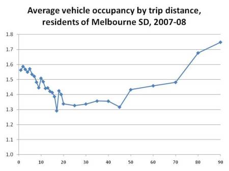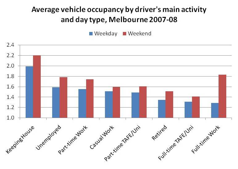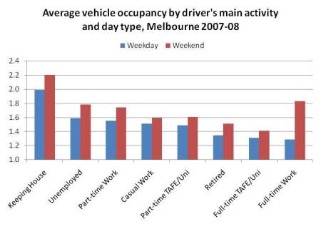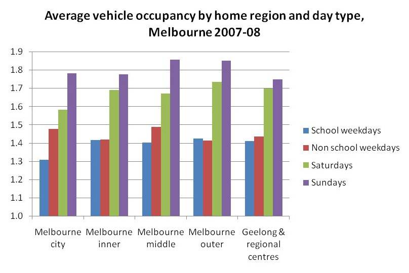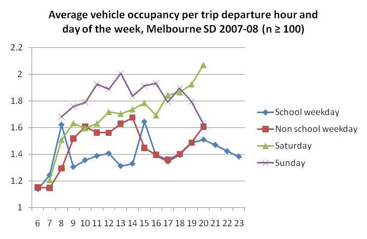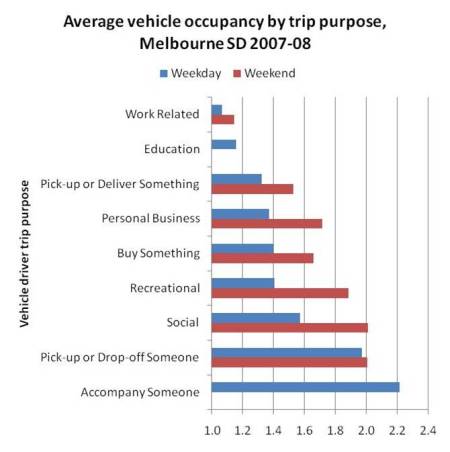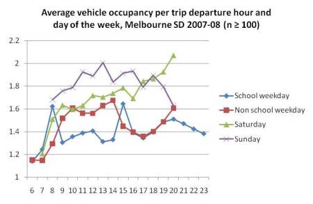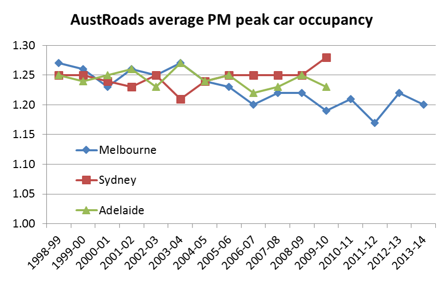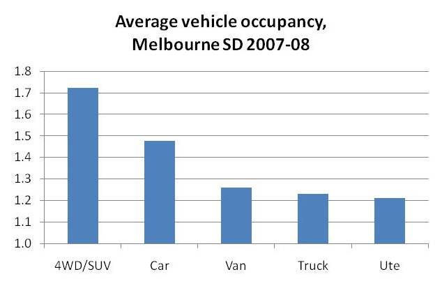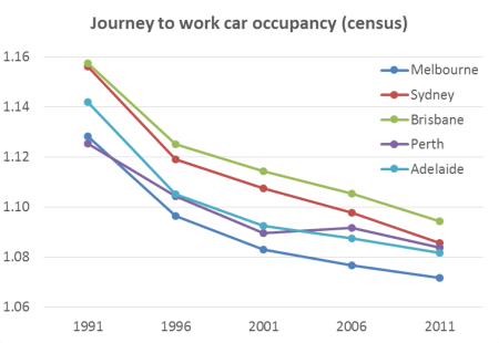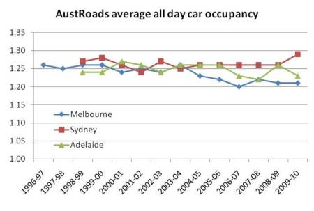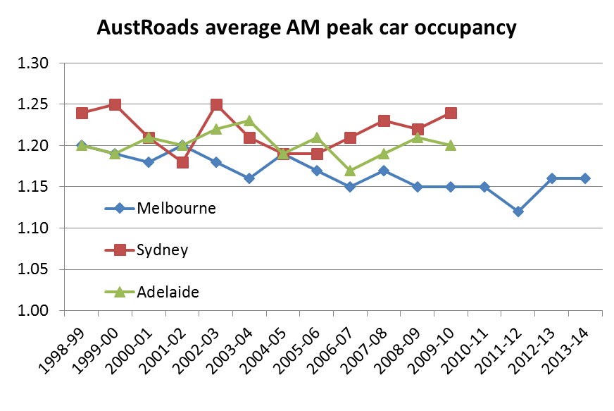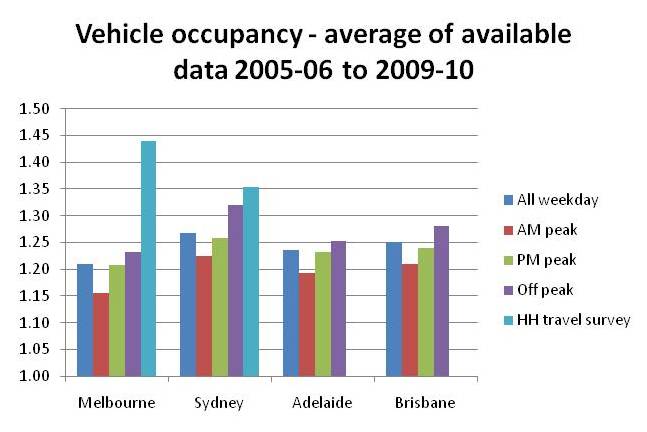 But the AustRoads data is certainly collected on representative arterial roads, where you might expect lower occupancy because of longer trips that are more likely to be work-related.