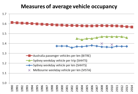 The BITRE figures show a fairly smooth and slow downwards trend from 1.62 in 1990 to 1.57 in 2014. The Sydney figures are a little more noisy, but surprisingly quite flat around 1.37 (on a distance measure), and increasing on a trip basis (suggesting occupancy is rising on shorter trips and/or declining on longer trips). Only the BITRE figures are confined to passenger vehicles, which probably explains the differences between the series (the SHHTS and VISTA data will include private vehicles such as motorbikes, trucks and light commuter vehicles).