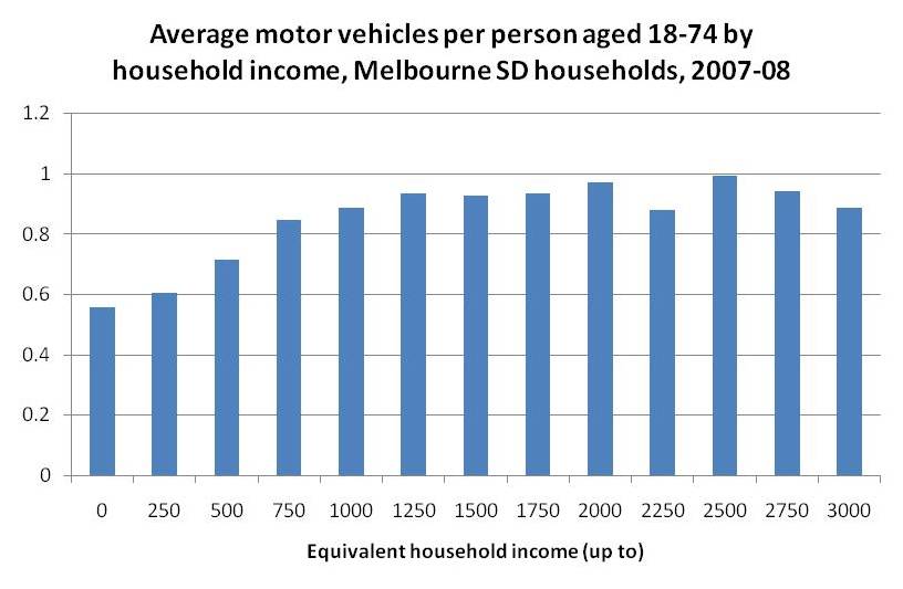 The threshold for car ownership is around $1250 per week (equivalised to a single occupant household). As Australians have become increasingly wealthy in real terms, we can afford to own more cars.