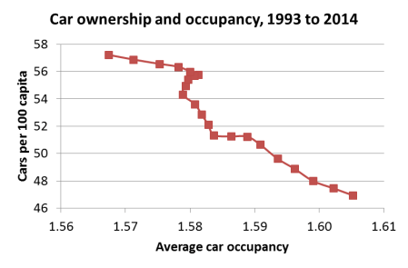 You might expect car occupancy to go down as car ownership goes up. In other words: we have more cars and need to share them less.