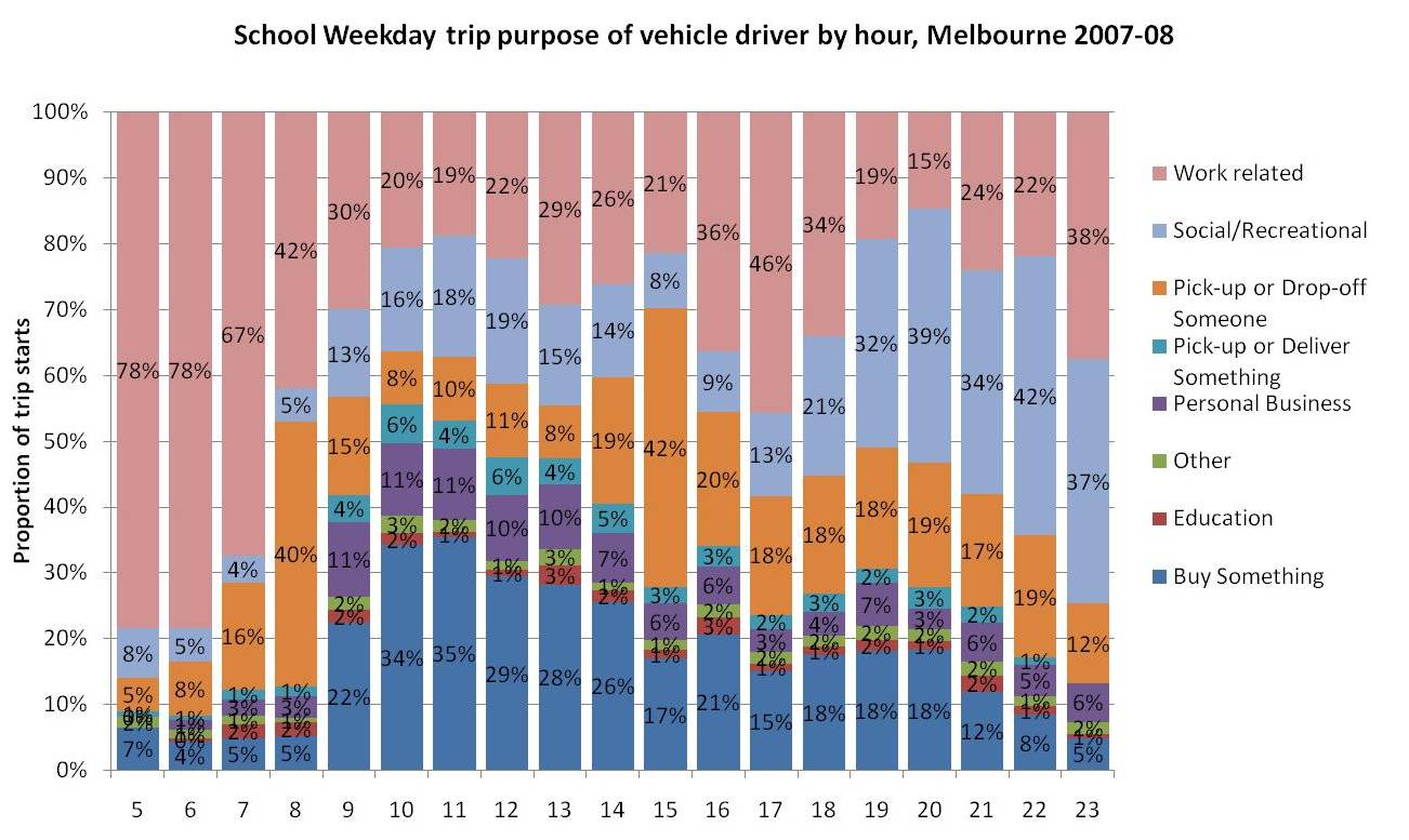 Just looking at the school peak more closely, here is a chart showing car driver trip purposes by hour of the day on school weekdays. You’ll almost certainly have to click on this one to read the detail.