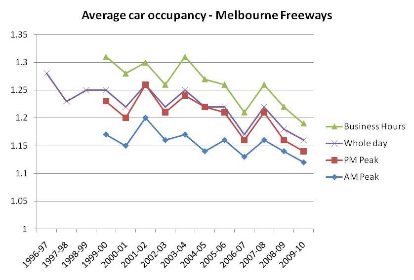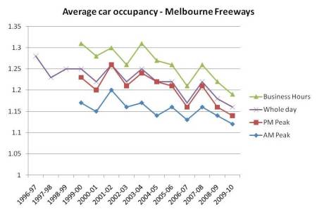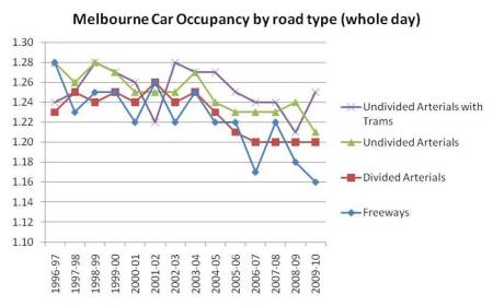 Looking at Melbourne data in more detail, car occupancy appears to have declined most on freeways and divided arterials: