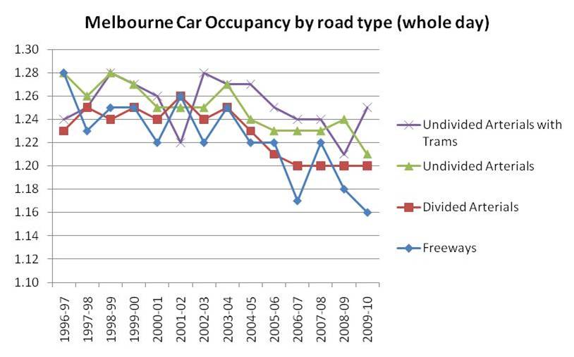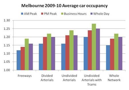 Here is a chart comparing car occupancy figures for arterial roads in Melbourne (2009/10):