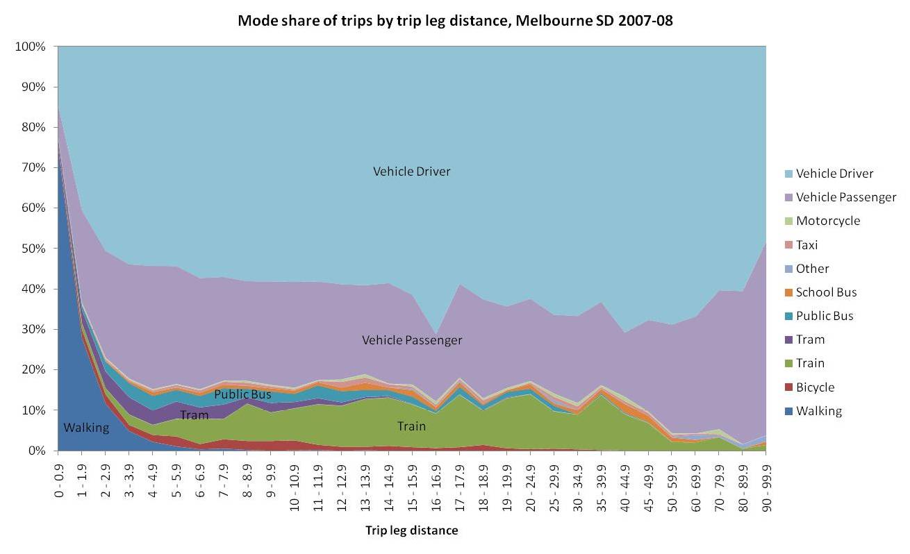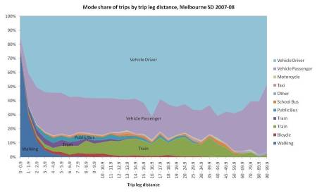 In fact, here is a mode share breakdown by trip distance (for trip legs):