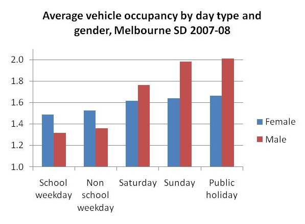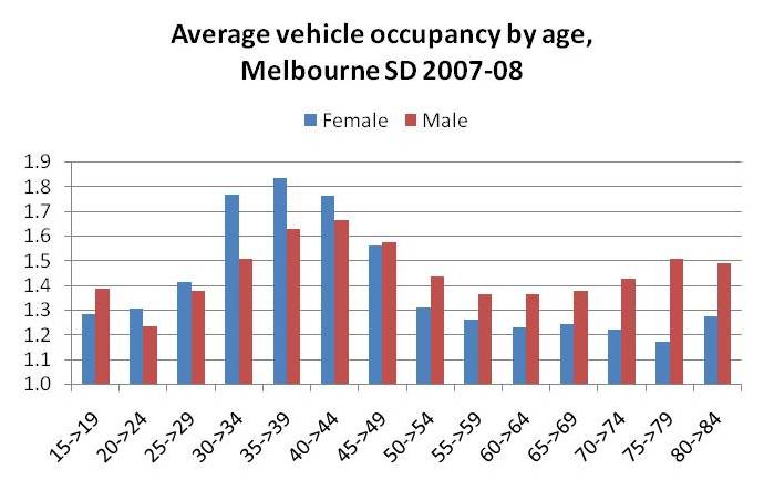 This would suggest traditional gender roles are in play: Average car occupancy is highest for drivers aged 30-45, the most common age groups for parents of pre-driving aged children. And women seem to be doing more ferrying of the kids than men. In the older age groups men are more likely to be driving with passengers.