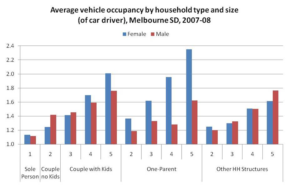 Note that the sample size of one parent households of size 5 are small (especially for male drivers). But curiously single mothers have much higher occupancies than single fathers.