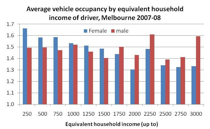 Vehicle occupancy seems to go down as we have higher incomes (moreso for females), but there seems to be some noise in the data (eg the spike at 3000 is due to one vehicle with 12 occupants). Females with lower household incomes have higher vehicle occupancies (maybe those without an income but looking after a family).