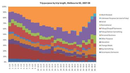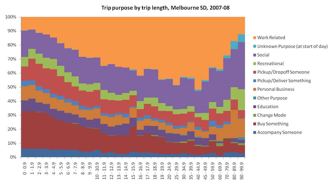 While there is probably a little noise in this data, there is a fairly clear pattern. Very short trips and very long trips are likely to have higher occupancies. The median trip distance for non-work trips is around 4kms, while work trips are much longer, which fits with the average occupancies for different trip purposes.