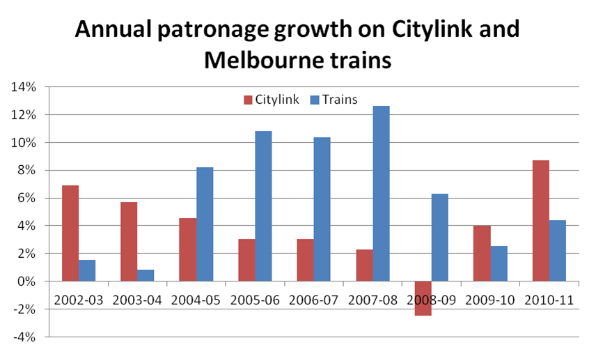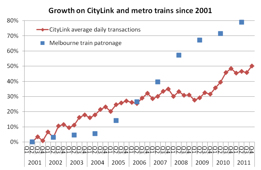 There was very little train growth in the first few years of CityLink (which started in 2001). But then train patronage grew strongly from 2005 while CityLink transaction growth went flat until 2010. A major upgrade project on the eastern leg of CityLink (M1 upgrade) caused delays between 2007 and early 2010, and there was little traffic growth. After the project was largely completed and the fourth lane opened, traffic growth accelerated over 2010. This happened at much the same time that trains recorded weak patronage growth. Then in 2011, train patronage grew again, while traffic seems to have flattened again.