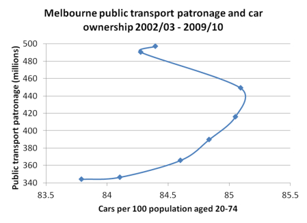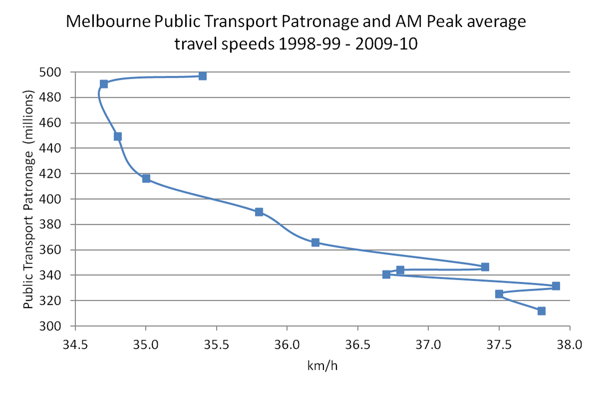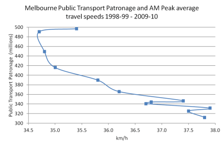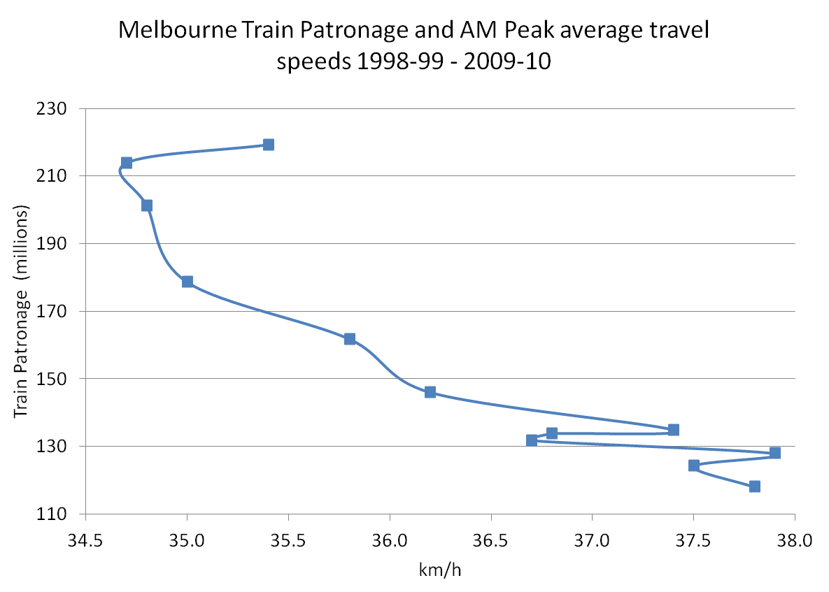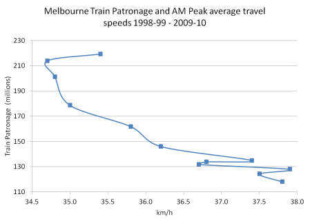 Until 2006-07 there was a fairly linear correlation, but then speeds only slowed slight while public transport patronage increased. In 2009-10 speeds increased and public transport patronage grew slowly. Perhaps congestion wasn’t a driver for patronage growth in 2009-10?