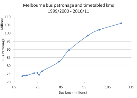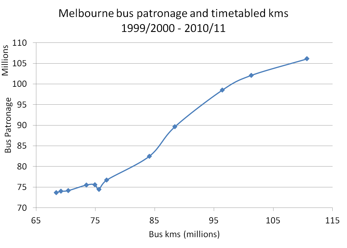 There does seem to be a stronger relationship between bus kms and patronage. This is perhaps to be expected as bus service levels are on average very low in Melbourne, so improved service levels are likely to result in existing users travelling more, and better attract new users.