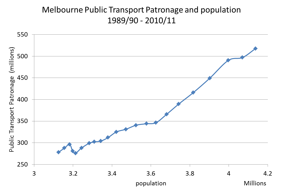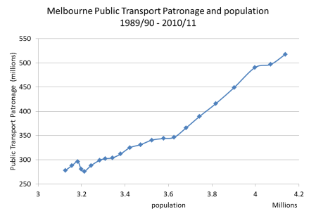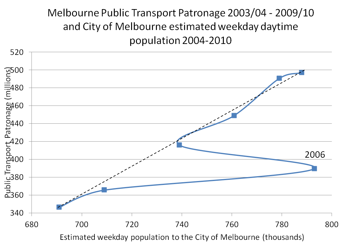 The year 2005/06 includes the 2006 Commonwealth Games that were held in March 2006 and boosted city visitors considerably. If you take out this anomaly, the other four data points look like they form a very linear pattern (as drawn), suggesting it is quite probably a strong driver. There was weak growth in both public transport patronage and city population in 2009-10, suggesting a strong relationship.