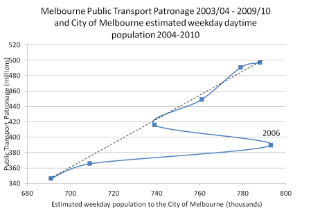 Another hypothesis suggests that if PT is heavily focussed on the inner city (where it has the highest destination mode share), then if more people need to travel to the inner city, this would probably increase PT patronage. This sounds very plausible, especially for trains and trams. The City of Melbourne has estimated weekday daytime population for 2004 to 2010 calendar years. So I am mixing calendar year visitor data with financial year PT patronage – which is not ideal. Anyway, here is what that relationship looks like: