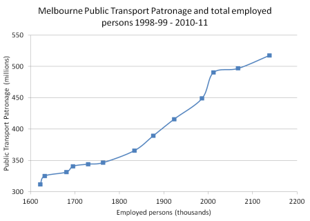 Again, the relationship isn’t very linear – despite a small growth in employed persons in 2008-09, public transport patronage still increased significantly. But then in 2009-10, employed persons grew but patronage didn’t. Likewise PT patronage increased more between 2000/01 and 2001/02, despite little growth in total employment, whereas in the previous year employment grew strongly, but PT patronage didn’t.