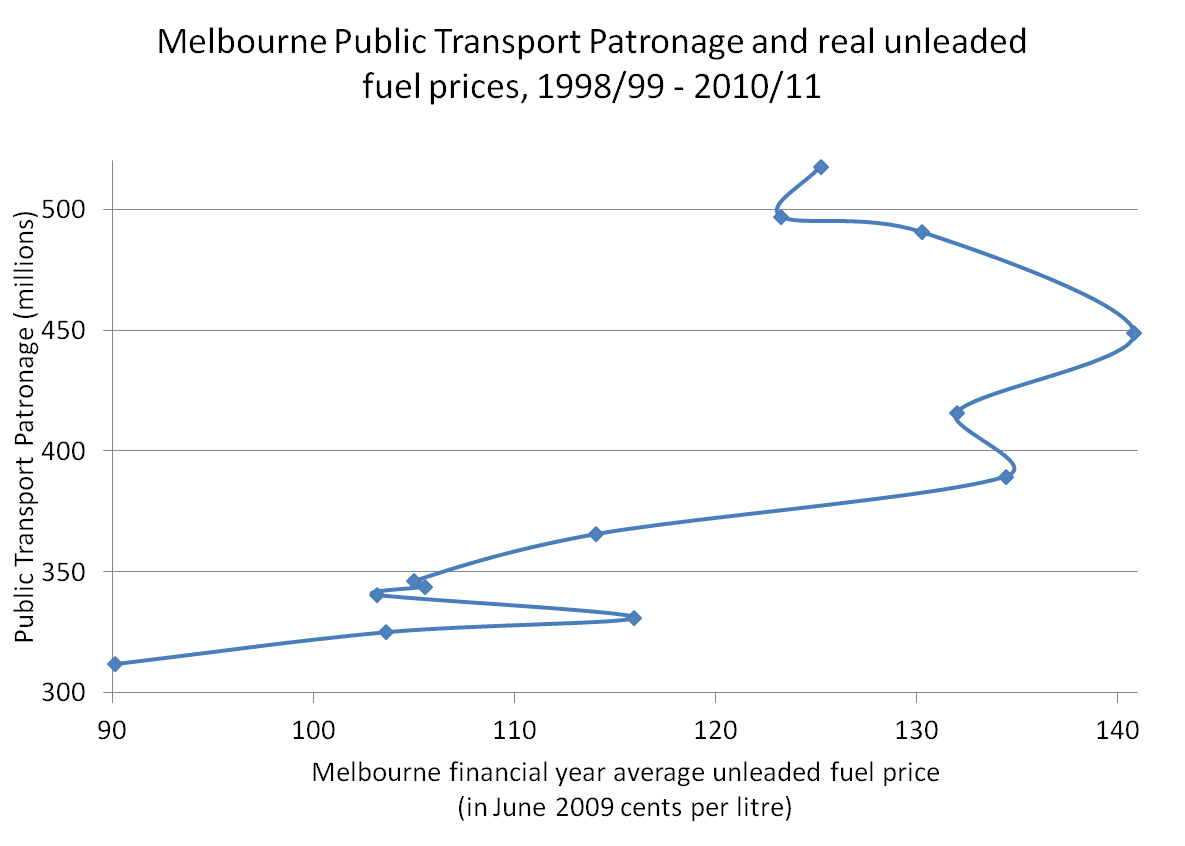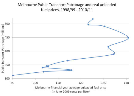 Fuel prices are highly volatile, even on an annual basis. Again, even though fuel prices dropped in 2008-09, PT patronage still increased. There seems to be a lot more at work than fuel prices. That said, since 2004-05, real fuel prices jumped from around 115 cents to over 130 cents and have remained higher since. So fuel might be an explanation for the kick up in PT patronage since 2005, perhaps more as the breaking of a psychological price barrier. Or perhaps people’s responses to fuel prices have longer lag times that wash out short-term fluctuations – as people make major decisions – such as the decision to purchase a new car or not. More on that later.