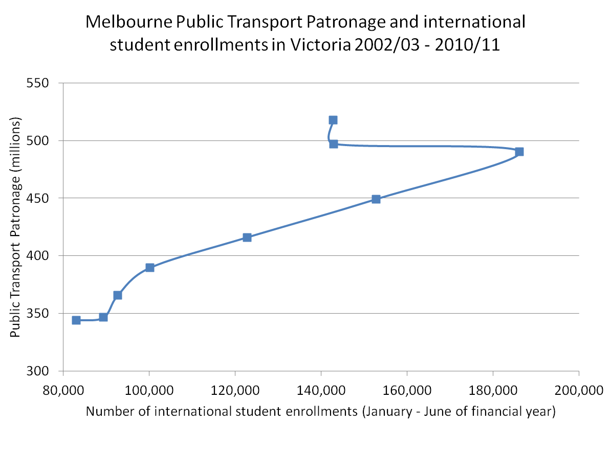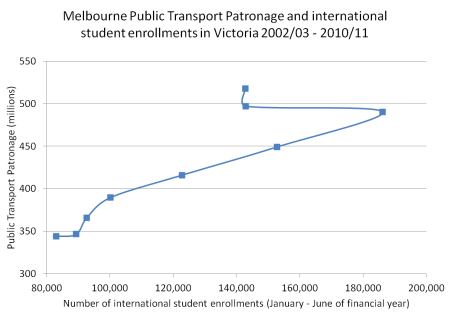 The international student numbers are very small in comparison to the total patronage. However if half of those students averaged 10 trips per week for say 40 weeks a year (purely a guess), that’s 38 million trips. I’ve not got data on what their PT use is actually like (I suspect many live close to their school or university and actually walk). And their boom doesn’t coincide with the boom in public transport patronage that started around 2005. So they might be having an impact – hard to conclude much.