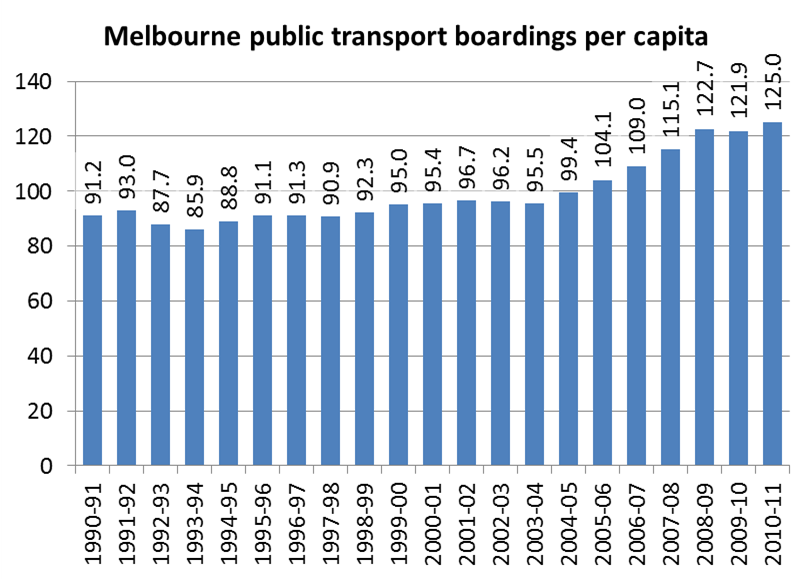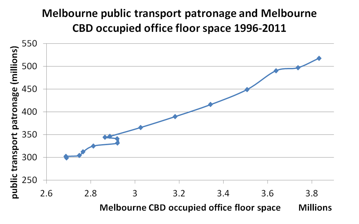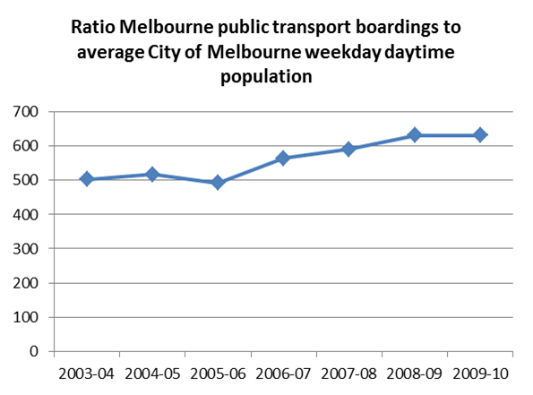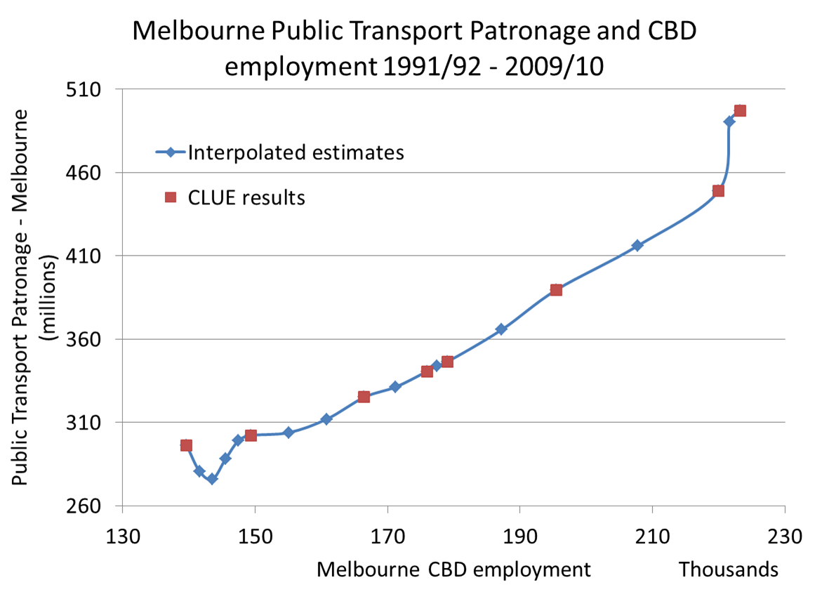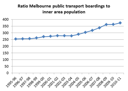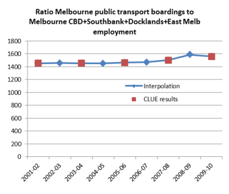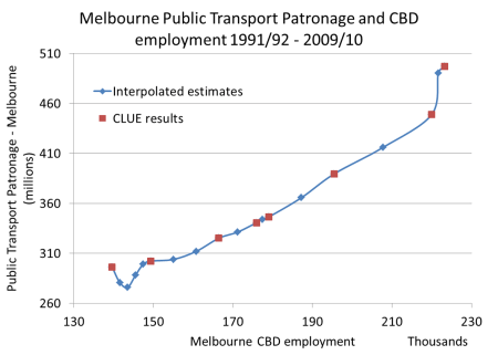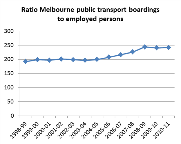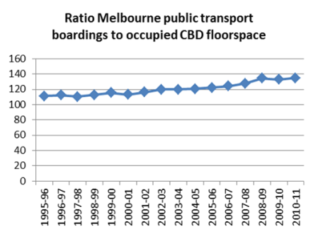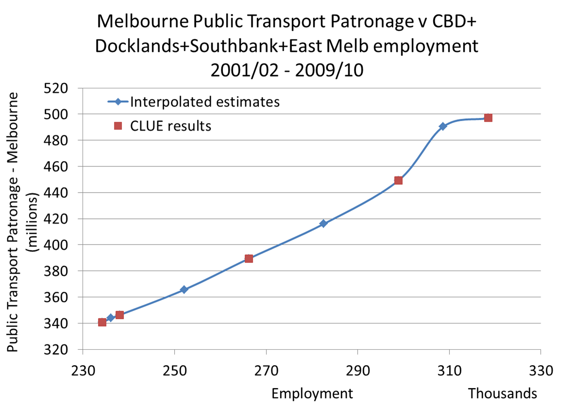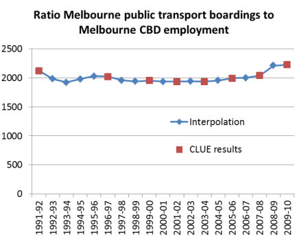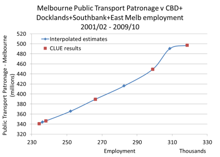 This chart also shows kinks in the trend around 2005 and in 2008-09 – so employment doesn’t seem to explain the kink. Note also that journeys to work only make up around 40% of public transport trips in Melbourne (according to VISTA data). And public transport has a very low mode share of journeys to work outside the city centre.