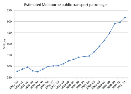 The boom in international students looks like it really took off in 2007, but fell away sharply in 2009-10 and has been lower since. In 2009-10 patronage grew more slowly, perhaps reflecting the drop in international student numbers. But 2010-11 patronage growth was strong again, despite little growth in international student numbers.