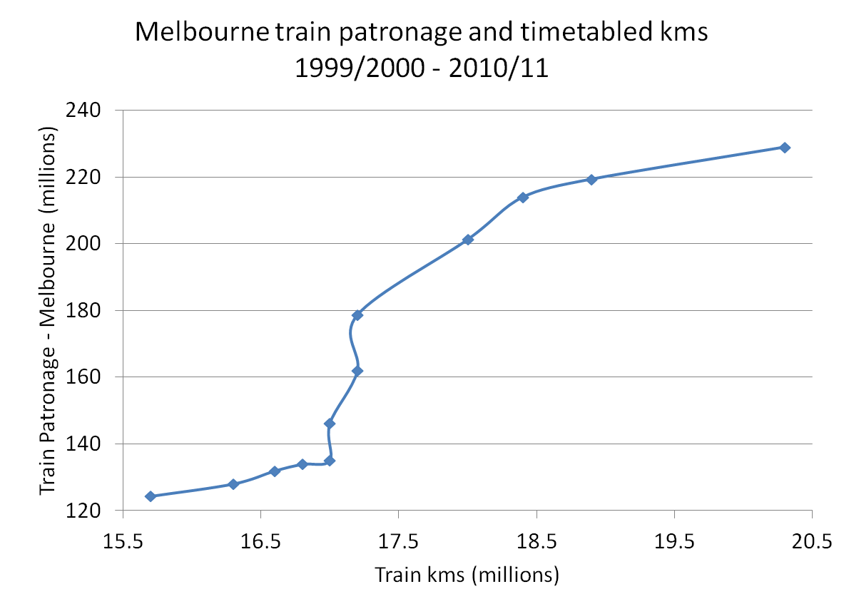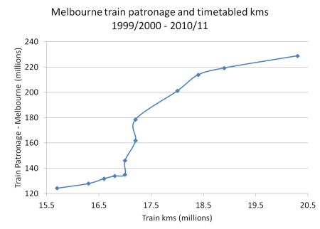 Train patronage doesn’t seem to be very strongly related to timetabled kms. Perhaps this is because the service levels at peak times on most lines are already attractive from a frequency point of view at least. Many of the extra train kms are providing capacity without a substantial jump in frequency (although some of the additional kms have been in off-peak periods).  That’s not to suggest there isn’t a relationship, just that it doesn’t look likely to be the dominant driver. In the early 2000s it seems that there wasn’t a strong response to increased timetable kms (including Sydenham electrification in 2002), while in the mid 2000s patronage grew despite kms staying much the same (other factors must be at work).