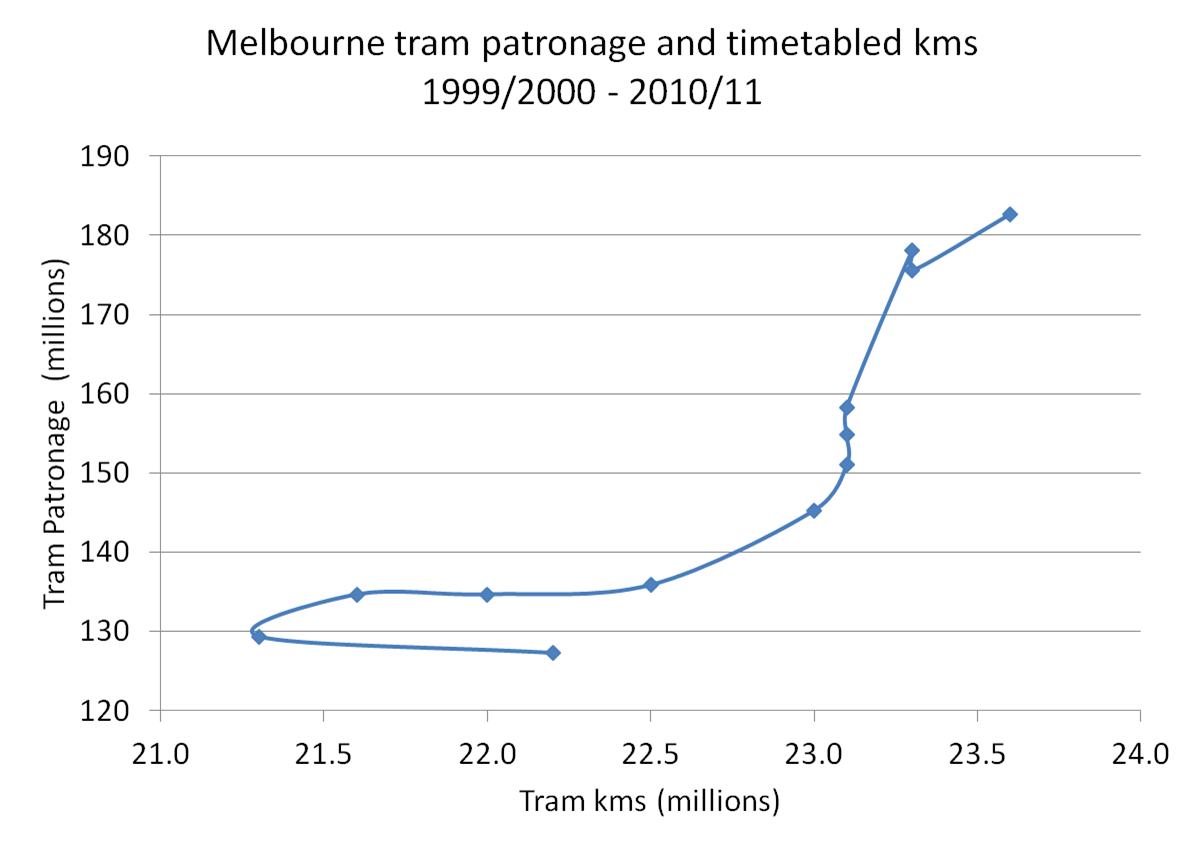 Again, not a strong relationship between tram kms and patronage, despite strong growth in timetabled kms in the early 2000s (partly from tram extensions into lower density suburbs in 2003 (Box Hill) and 2005 (Vermont South) – see here for more history). It also looks like some cuts in 2000 (when some city routes had to be joined due to the loss of W class trams) were done in a way that didn’t result in a loss of patronage. Perhaps because service frequencies were still fairly good after the cuts.