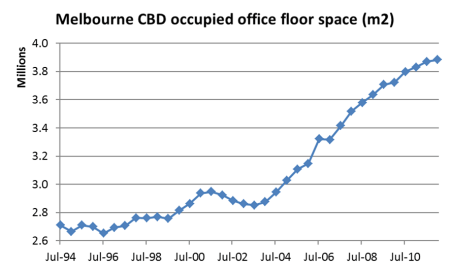 While the CLUE data series only runs until 2010 at present, a more timely and regular dataset that might be related to CBD employment is occupied office floor space, calculated from the Property Council of Australia’s Office Market Reports. While I do not have access to the reports themselves, much of the data is available on the internet in various forms, and I have used that data to reconstruct the data series (there is chance of errors creeping in, particularly for earlier years).