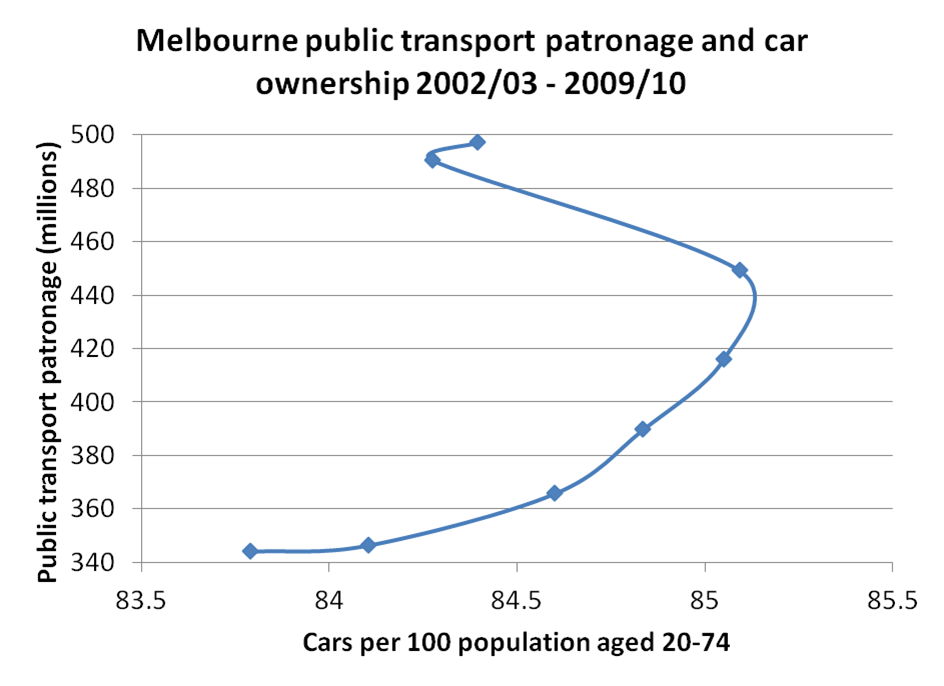 This chart shows in the early 2000s that car ownership rose quickly, while public transport patronage growth was slow. Then from 2006-07, car ownership levels peaked and public transport patronage grew quickly. Car ownership dropped in 2008-09 just as public transport patronage surged, but recovered in 2009-10, as public transport stalled. This suggests there may be some relationship between PT patronage and car ownership, but the annual change rates aren’t always consistent.