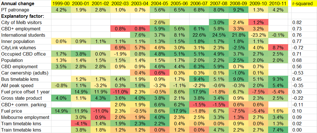 The following table shows the annual change in Melbourne public transport patronage and a number of potential explanatory factors. I’ve used conditional formatting such that darker green cells indicate values you might expect to contribute to strong PT patronage growth. Rows that have dark green in the same years as PT patronage are potentially stronger at explaining the trends in public transport patronage. I’ve also included the r-squared value for a correlation for each factor compared to PT patronage (based on annual growth rates, not actual values). You might need to click to enlarge and make it easier to read.