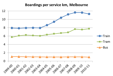 This chart shows increasing intensity of use of trains and trams between 2004 and 2009, while buses have remained around 1.0-1.1 boardings per service km for at least 12 years running. The significant difference between trams and buses is best explained by the territory covered: trams mostly the CBD, buses mostly not the CBD.