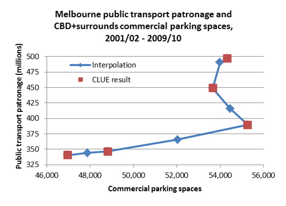 Between 2004 and 2006, commercial parking spaces grew strongly, while public transport patronage did not. Then public transport patronage grew strongly and there was actually a decline in the number of commercial parking spaces.