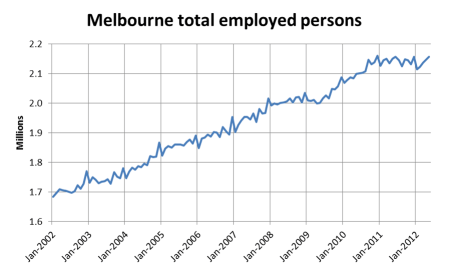 ABS publish figures monthly, and here’s the picture for total persons employed in Melbourne. There was virtually no growth between late 2010 and May 2012 (at least). There was also a flat patch between the start of 2008 and the middle of 2009 (2008-09 shows substantial patronage growth on public transport).