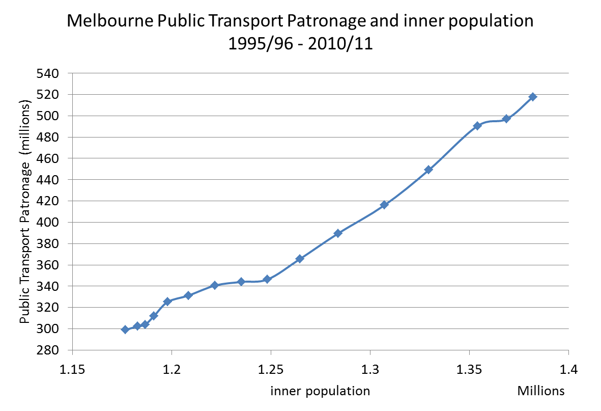 We know that public transport use is higher closer to the inner city of Melbourne. So is public transport better correlated with inner city population? The following charts compare PT patronage with “inner” population (LGAs of Melbourne, Port Phillip, Stonnington, Yarra, Hobsons Bay, Maribyrnong, Moonee Valley, Moreland, Darebin, Banyule, Boroondara, and Glen Eira).