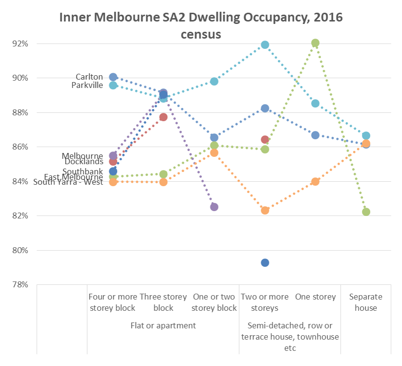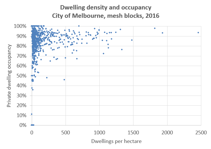 - There are examples of low occupancy apartment towers in Melbourne, but there’s not a clear relationship between dwelling density and dwelling occupancy in central Melbourne.