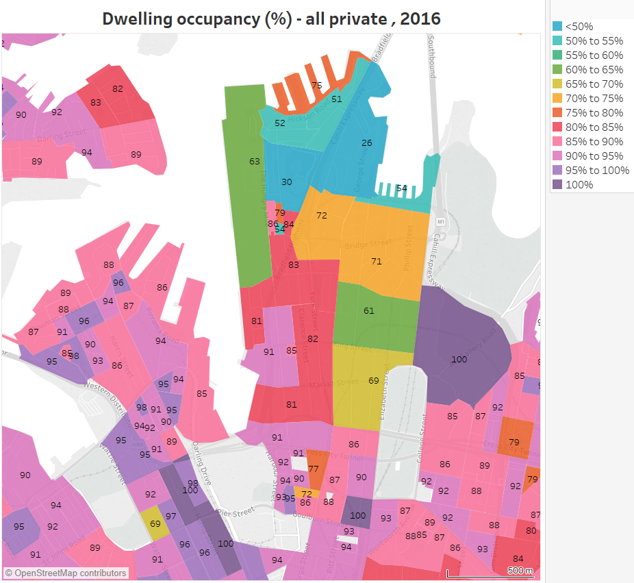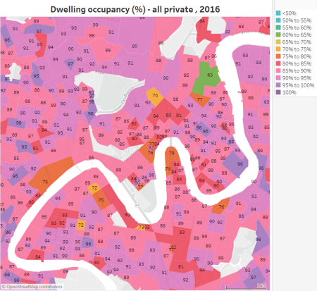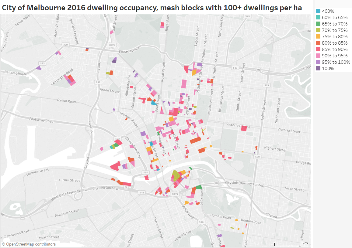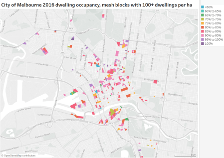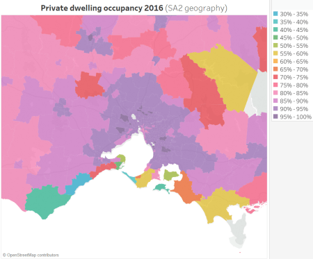 Here is dwelling occupancy in central Melbourne at SA1 geography for 2016, using the broader colour scale (also in Tableau):