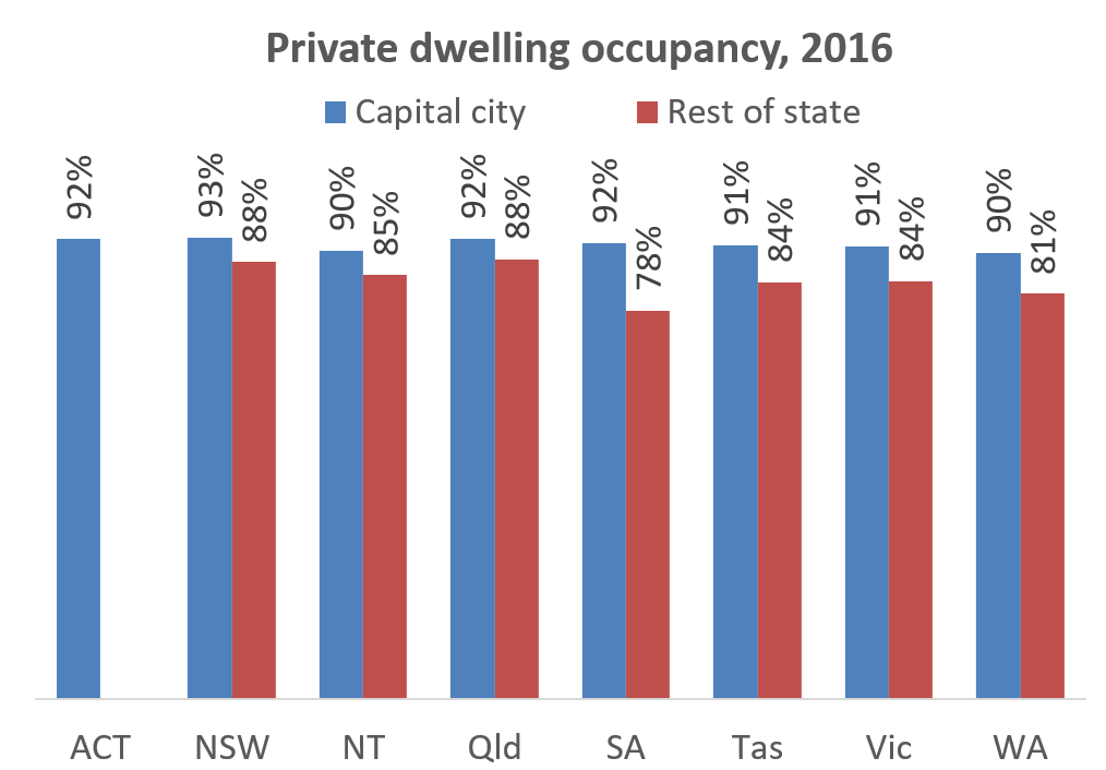 Private dwelling occupancy is significantly lower outside the capital city areas. While the capital city areas contain 63% of all private dwellings, they only contain 51% of unoccupied private dwellings.