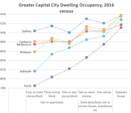 In many cities there is a strong correlation between housing type and occupancy, with separate houses having the highest occupancy rates, and multi-storey flats/apartments having the lowest. The pattern is strongest in Perth – perhaps reflecting reduced demand for apartment living following the end of the mining boom(?).