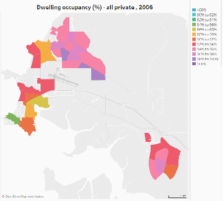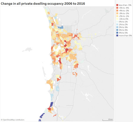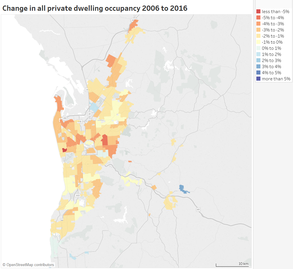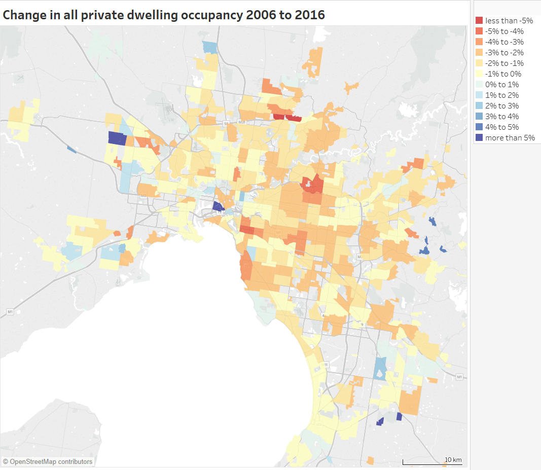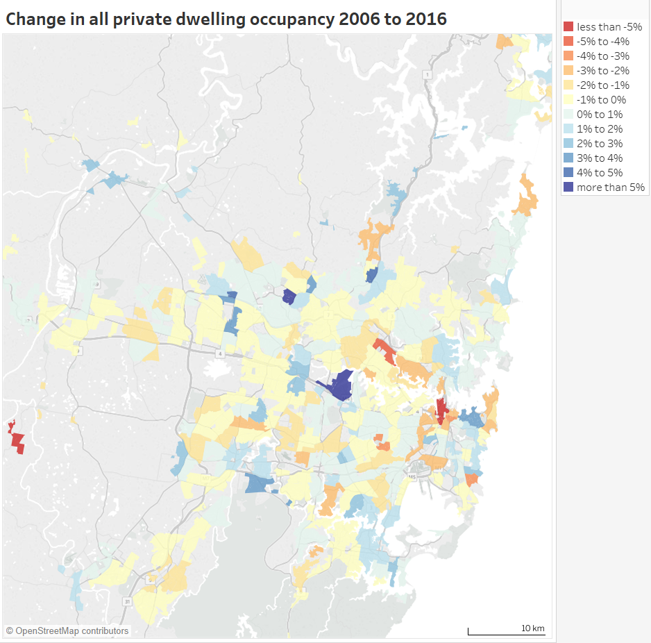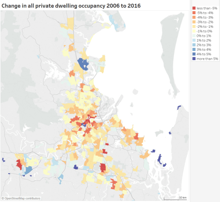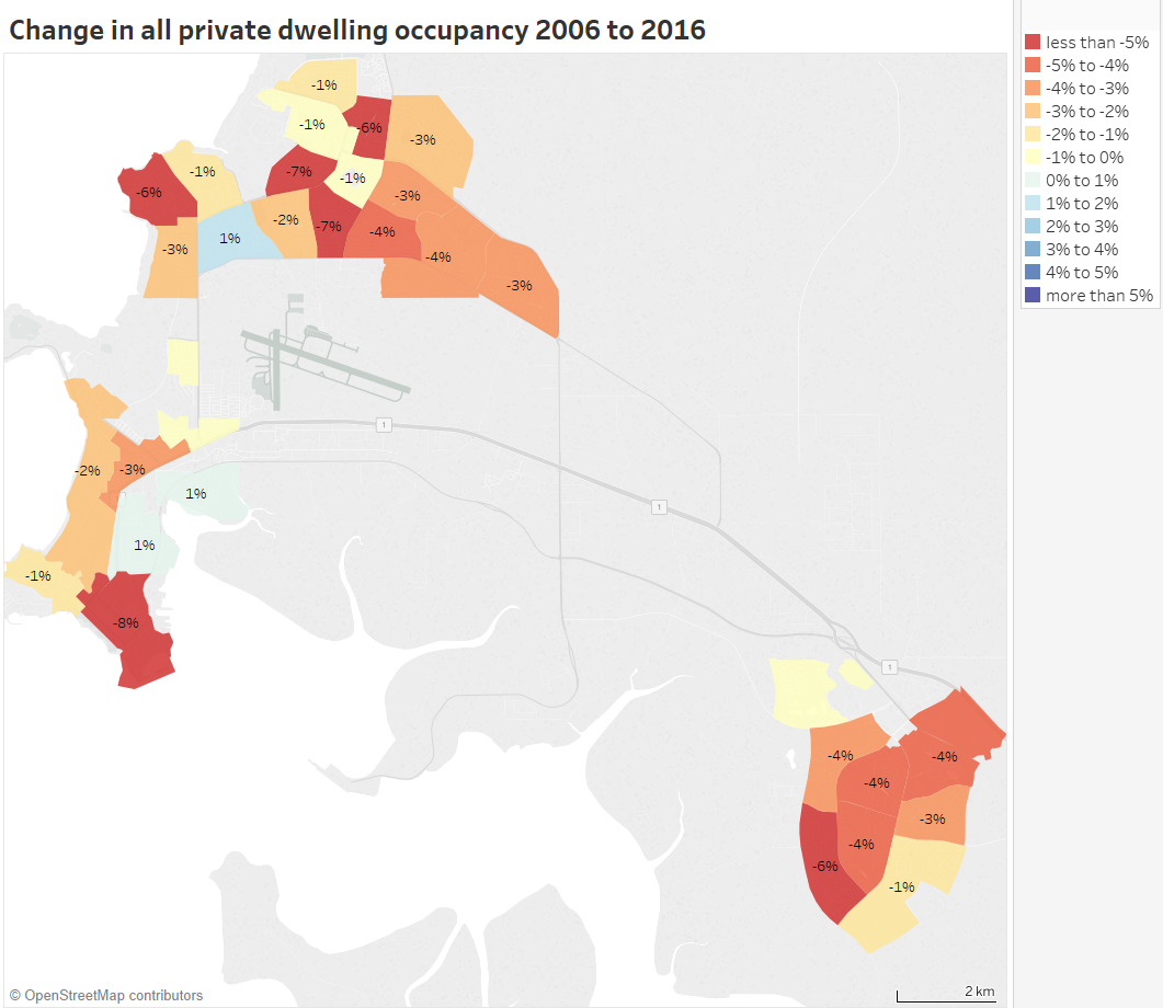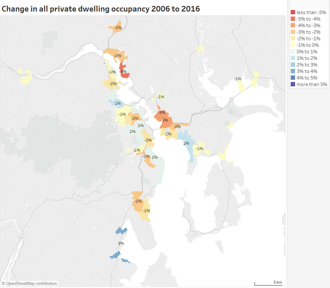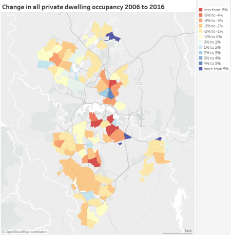 It can be a little difficult to see the changes in occupancy rates, so here is a non-animated map the change in dwelling occupancy rates between 2006 and 2016 (also in Tableau):