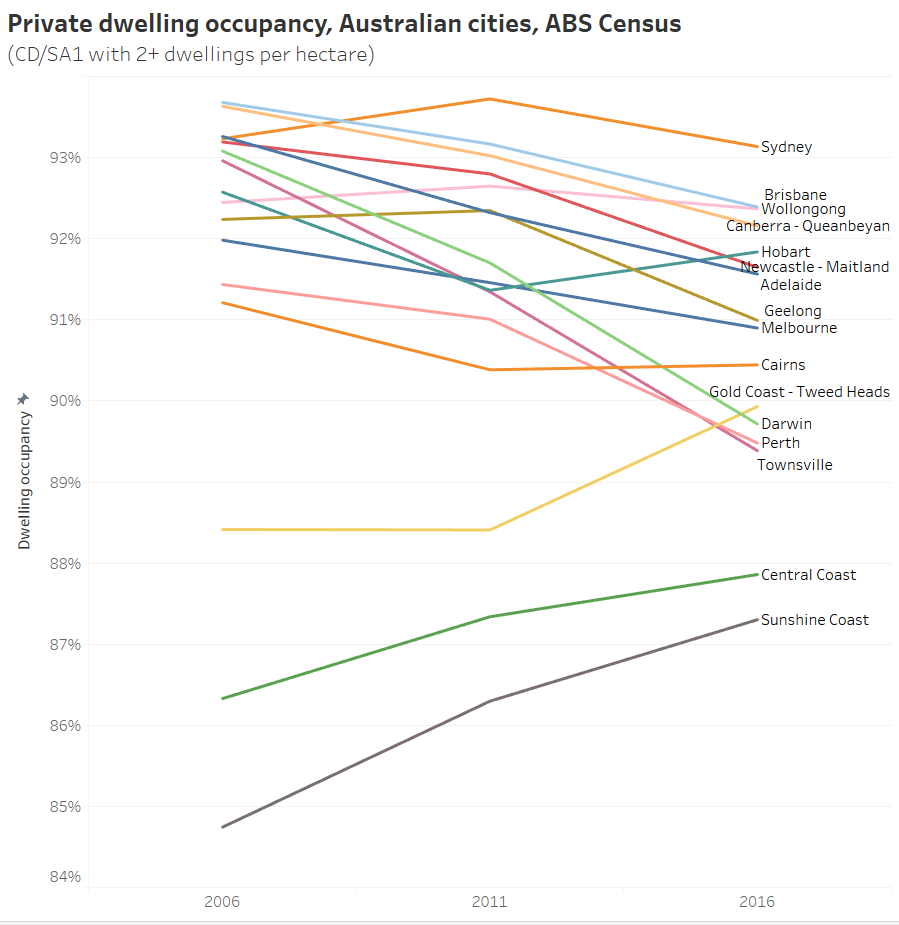 Note the y-axis only runs from 84% to 94%, so the changes are not massive. However a small change in dwelling occupancy can still have a large impact on housing prices (rental and sales).