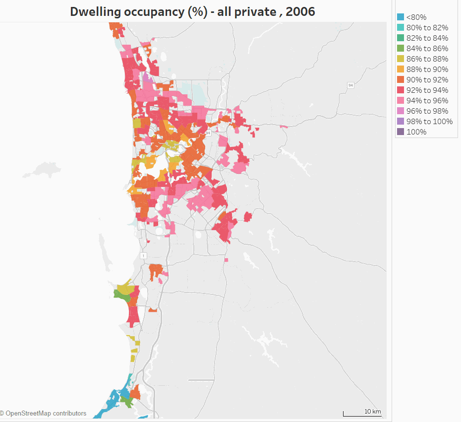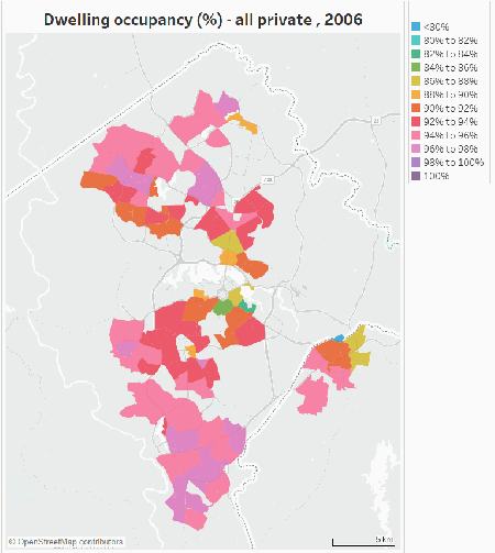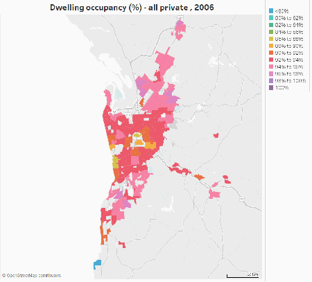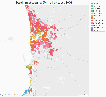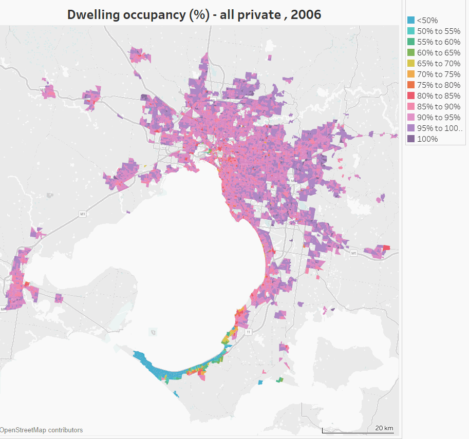If you want to see other cities, move around Australia in Tableau for occupancy maps at CD/SA1 and SA2 geography (choose you year of interest), and occupancy change maps (at SA2 geography).