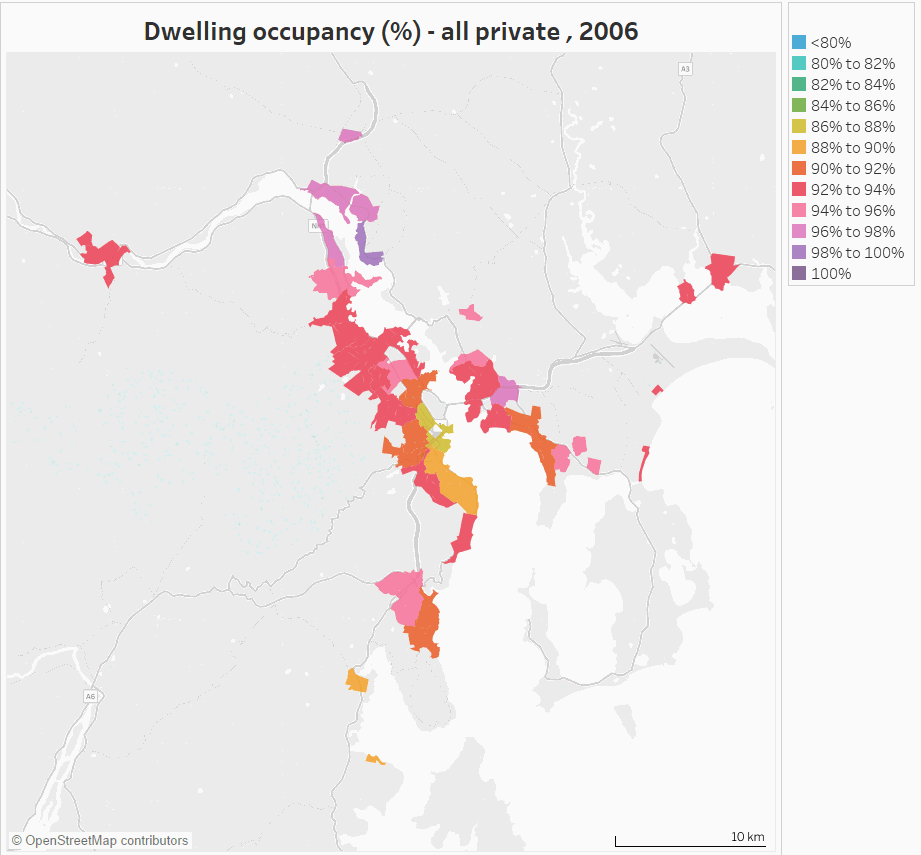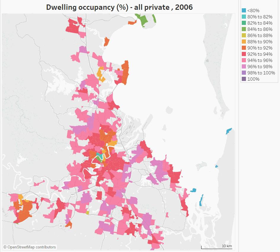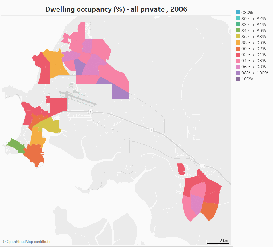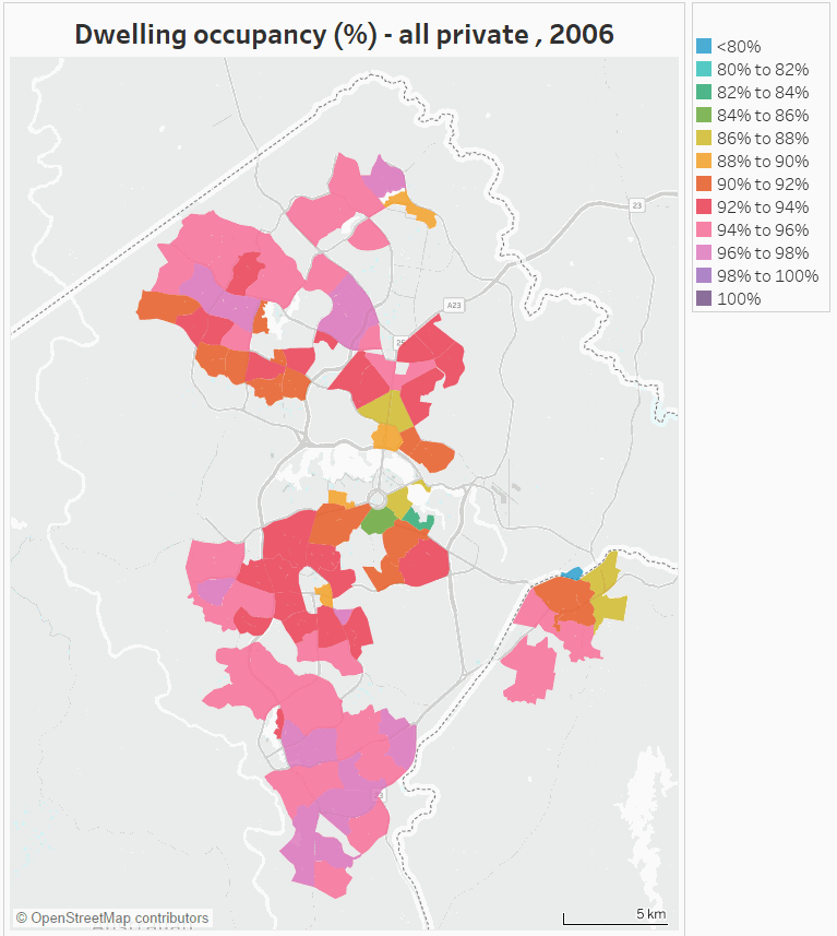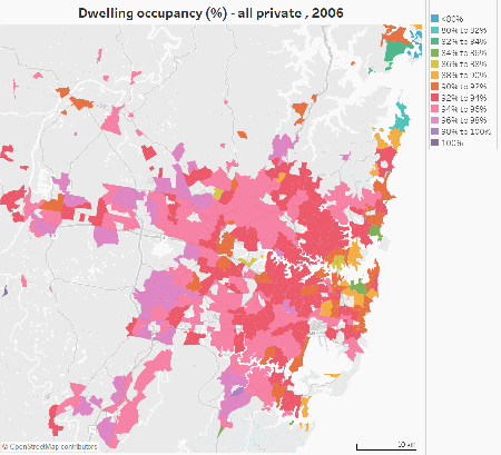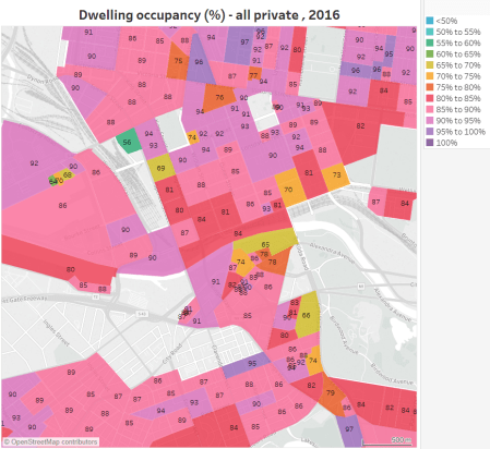 Explore the 2016 occupancy rates at SA2 geography for different dwelling types for any part of Australia in Tableau. You can also view changes in occupancy rates since 2006 for separate houses, flats/units/apartments, and semi-detached/townhouses.