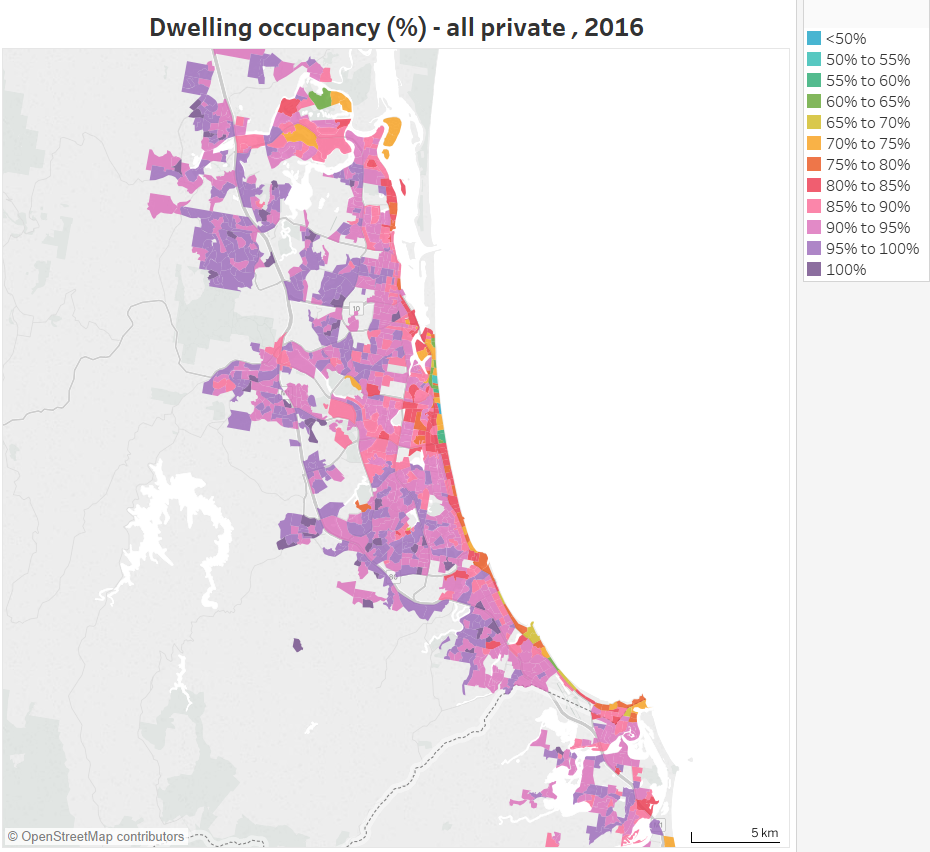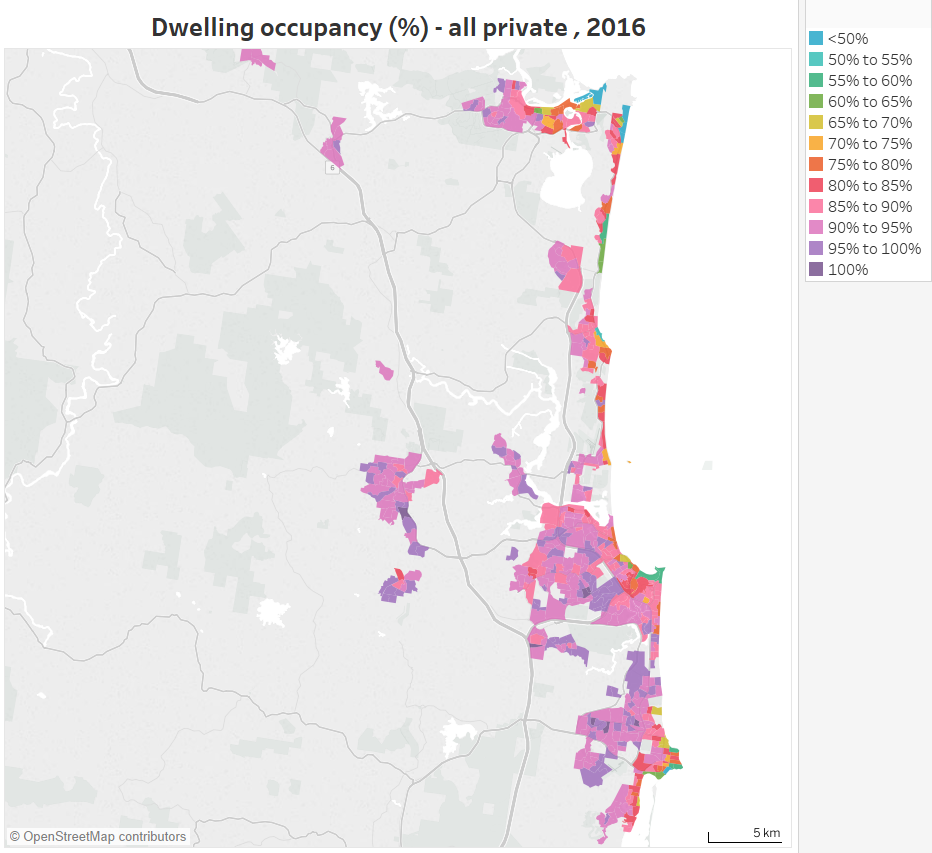 You can see quite clearly that the beach-side areas have low occupancy, while the inland areas have much higher occupancy (some at 100%). Presumably many permanent residents cannot or choose not to compete with tourism for beach-side living.