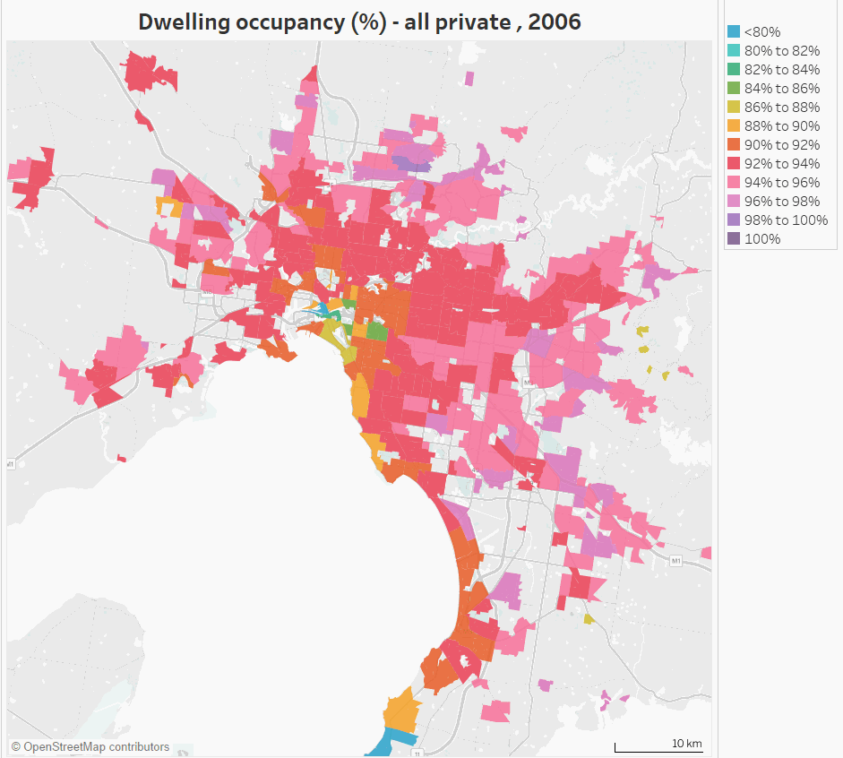 There are quite a few pockets of very low occupancy, particularly areas shaded in yellows and greens. The average private dwelling occupancy for the City of Melbourne local government area was 87%, lower than the Greater Melbourne average of 91%.