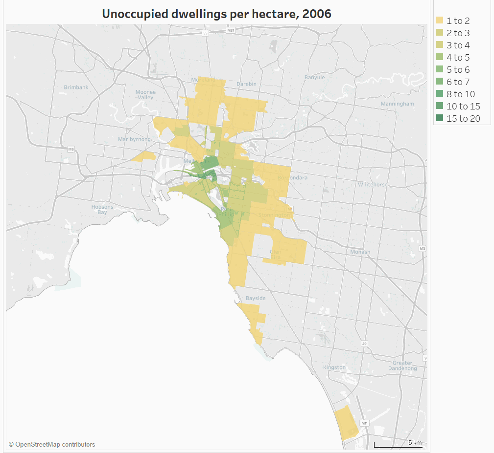 You can see a fairly significant increase in the number of unoccupied dwellings in the inner and middle suburbs (at least at densities above 1 per hectare).