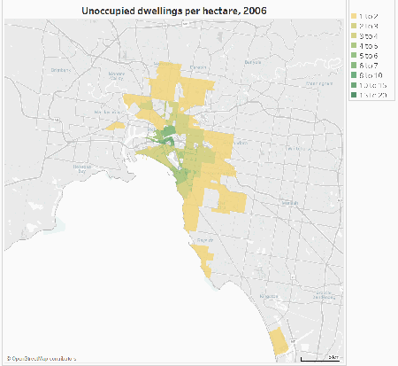 Quite simply, here is a map showing the density (at SA2 geography) of unoccupied dwellings in Melbourne over time (you might need to click to enlarge to read more clearly):