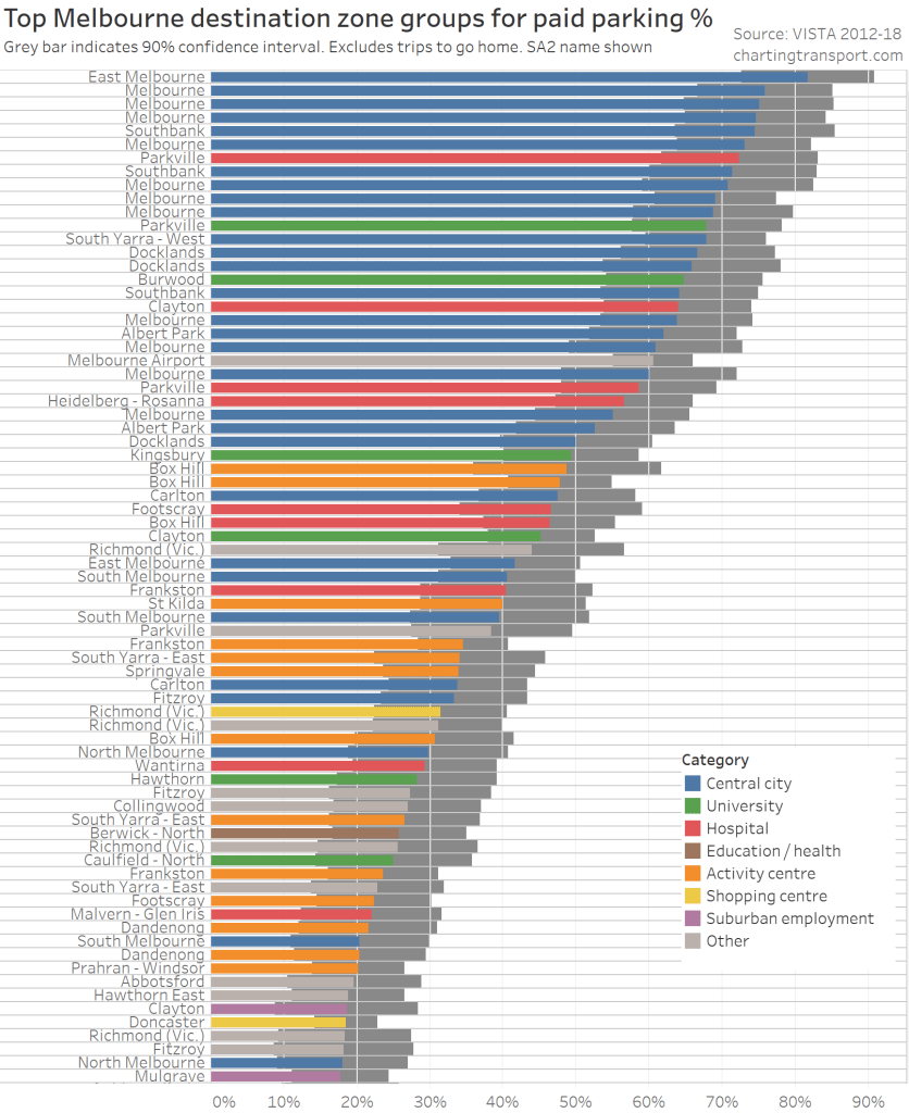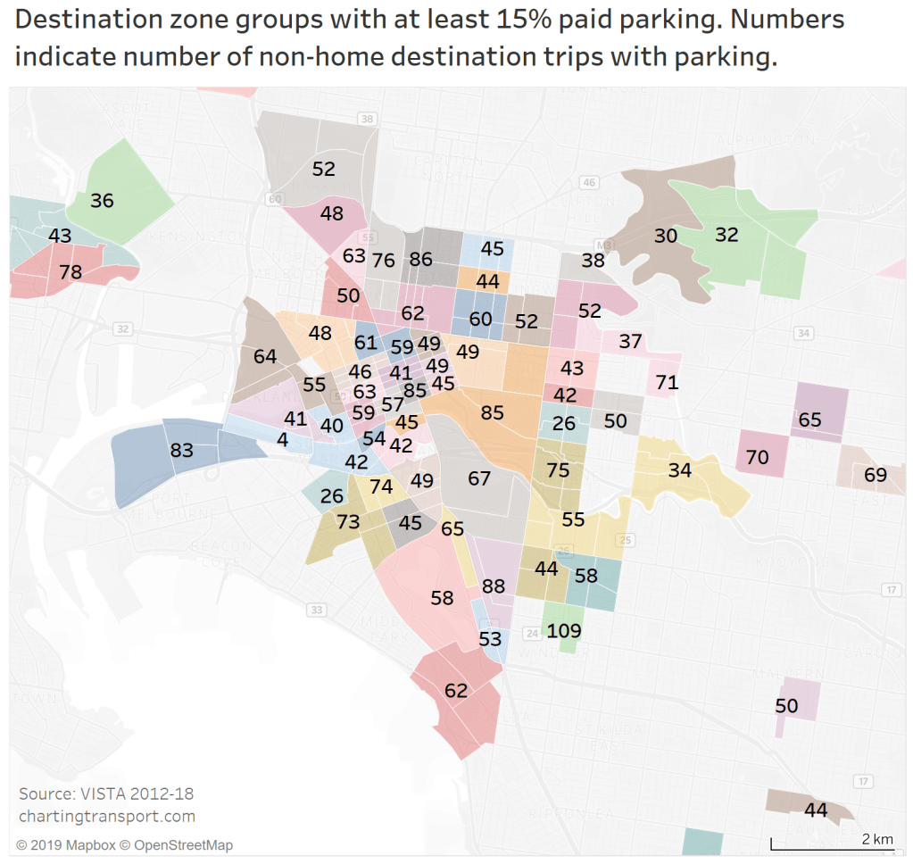 I’m not aware of an available comprehensive car park pricing data set for Melbourne. Parkopedia tells you about formal car parks (not on street options) and doesn’t share data sets for free, while the City of Melbourne provides data on the location, fees, and time restrictions of on-street bays (only). So I’ve created my own – using the VISTA household travel survey.