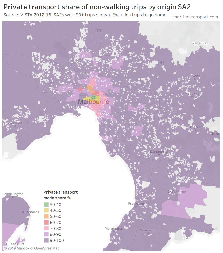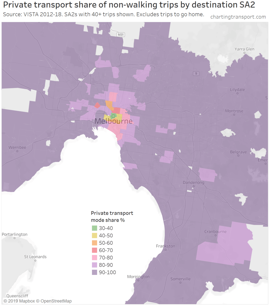 Here’s a map of private transport mode share of non-walking trips by SA2 destination: