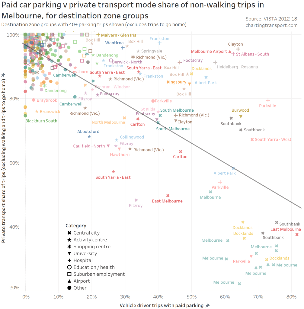 Some places to the bottom-left of the cloud on the chart include inner suburban areas such as South Yarra, Fitzroy, Richmond, Abbotsford, Brunswick, and Collingwood. While paid parking doesn’t seem to be as common, private transport mode shares are relatively low (even when walking trips are excluded). These areas typically have dense mixed-use activity with higher public transport service levels, which might explain the lower private transport mode shares. These areas probably also have a lot of time-restricted (but free) parking.
