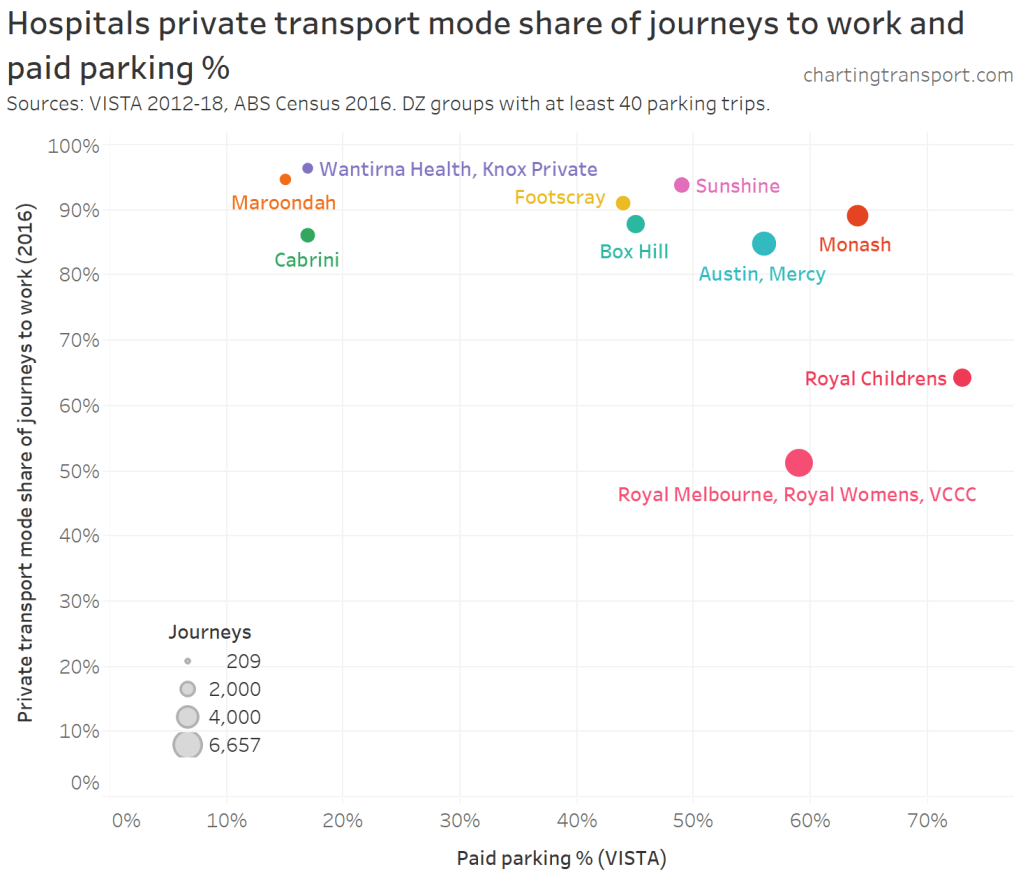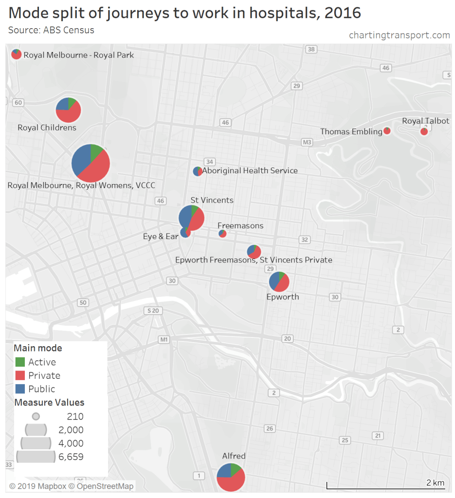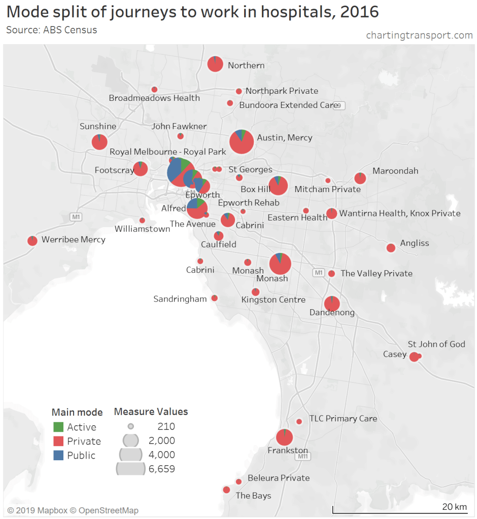 So perhaps the issue is as much to do with the public transport service quality of the trip origins. The hospitals in the suburbs largely serve people living in the suburbs which generally have lower public transport service levels, while the inner city hospitals probably more serve inner city residents who generally have higher public transport service levels and lower rates of motor vehicle ownership (see: What does the census tell us about motor vehicle ownership in Australian cities? (2006-2016)).
