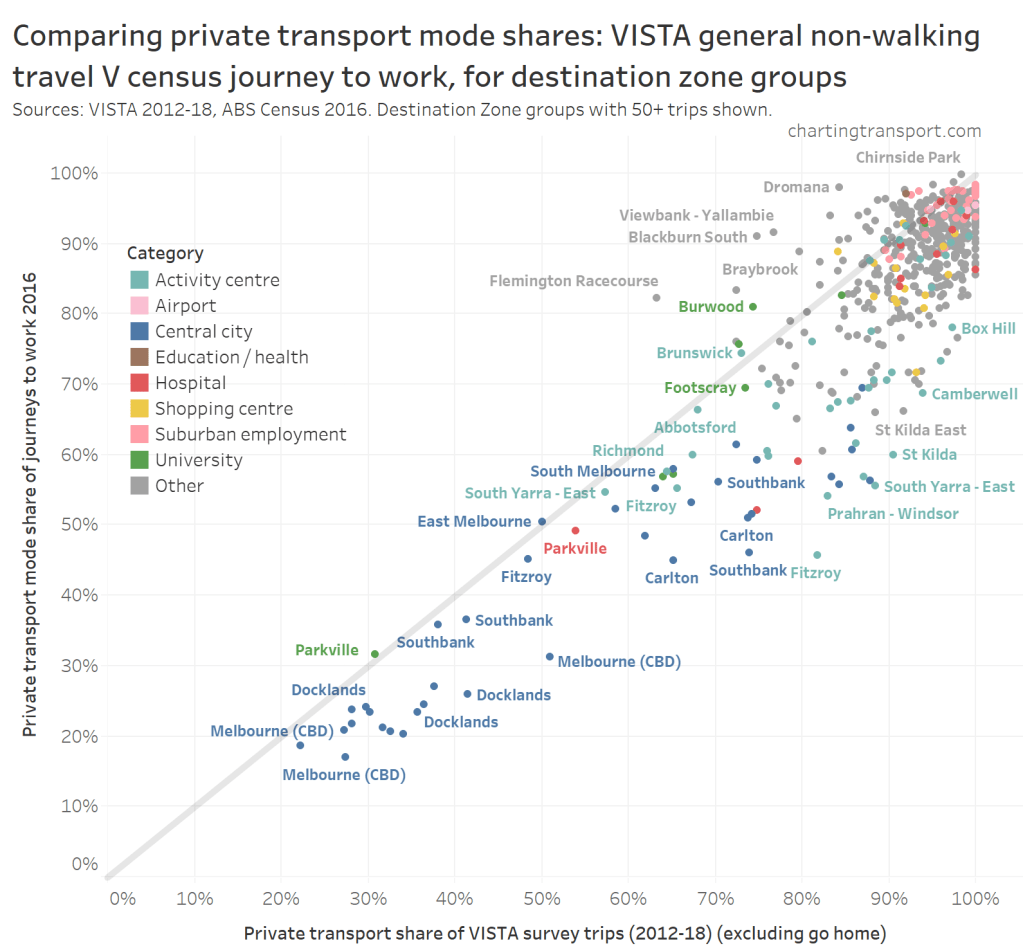 The DZ groups above the line include Flemington Racecourse (census day was almost certainly not a race day so there was probably ample parking for employees, while many VISTA survey trips will be from event days), Deakin Uni (Burwood), and a few others. Some of these DZ groups are dominated by schools, where workers (teachers) drive while students are more likely to cycle or catch public transport.
