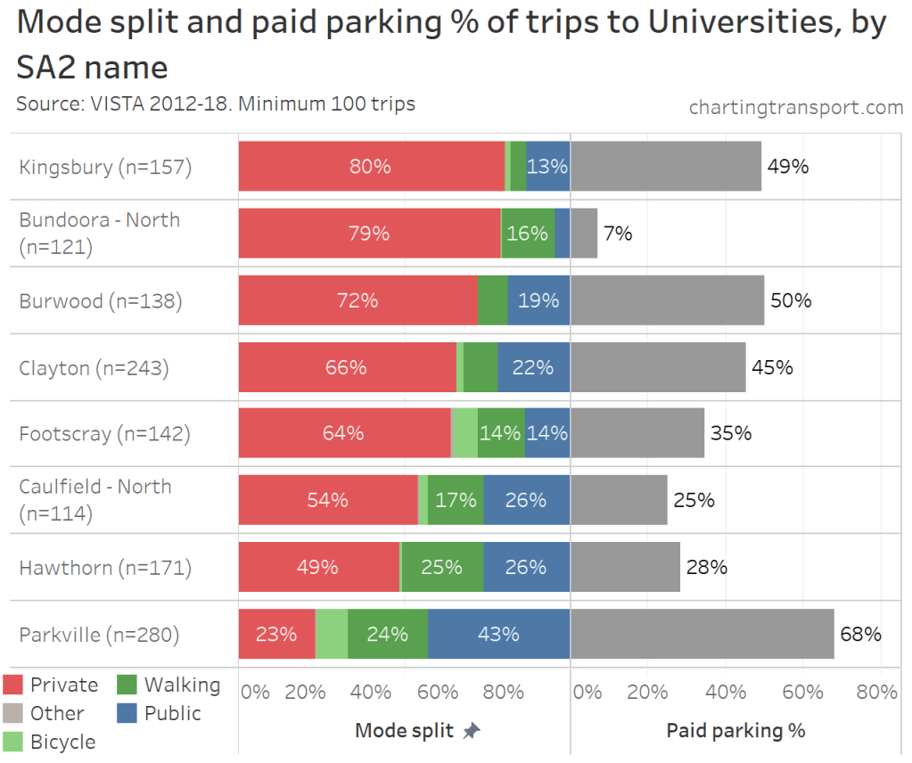 The biggest university outliers above the line (higher private mode shares and higher paid parking %) are Deakin University (Burwood) and La Trobe University (Kingsbury). Furthermore, private transport also has a majority mode share for Monash University Clayton, Victoria University Footscray Park, Monash University (Caulfield) and Swinburne University (Hawthorn).