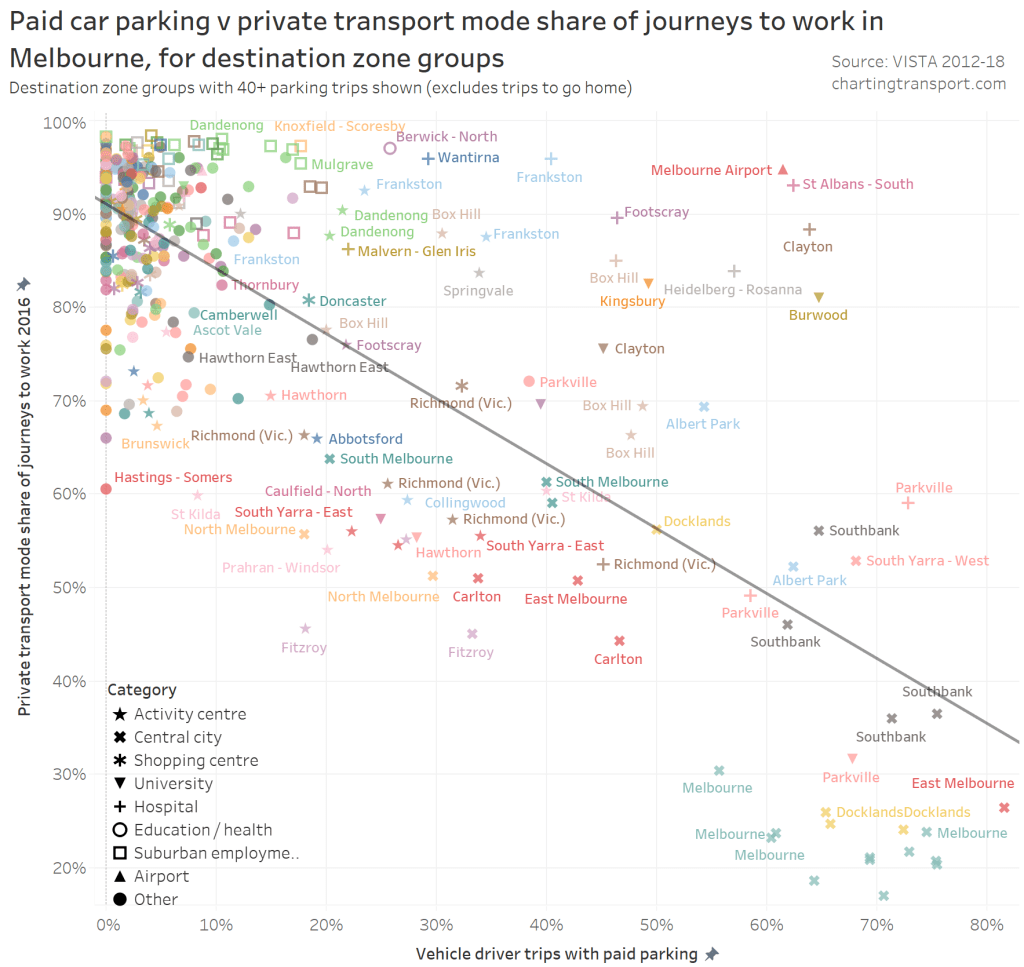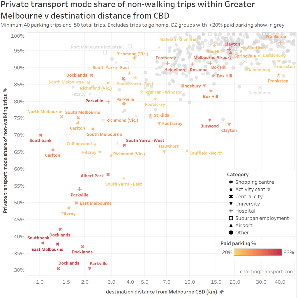 Even if there isn’t much paid parking, destinations well served by public transport tend to have lower private transport mode shares (although this could be related to time-restricted free parking).